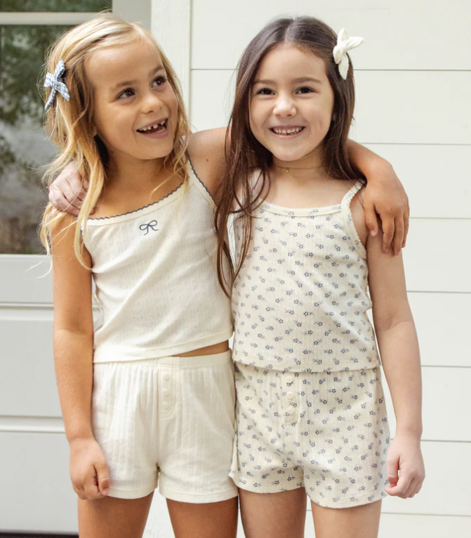 Our Pointelle Lounge Set features scalloped stitch detail on the straps and neckline for a sweet finish.Featuring our embroidered 'marine bow' spot print on our 'ivory' hue.